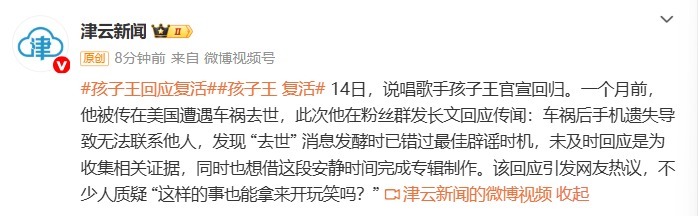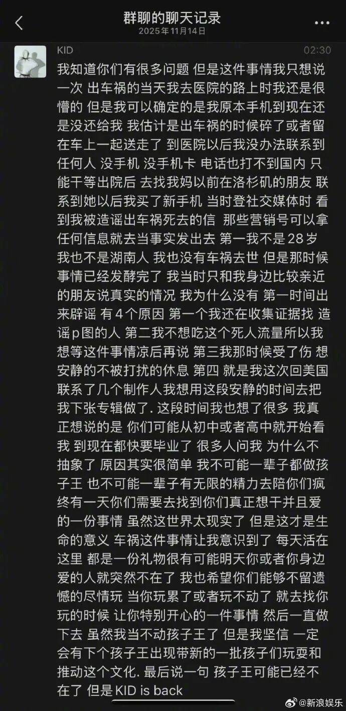 14日,说唱歌手孩子王官宣回归。一个月前,他被传在美国遭遇车祸去世,此次他在粉丝群发长文回应传闻:车祸后手机遗失导致无法联系他人,发现 “去世” 消息发酵时已错过最佳辟谣时机,未及时回应是为收集相关证据,同时也想借这段安静时间完成专辑制作。该回应引发网友热议,不少人质疑 “这样的事也能拿来开玩笑吗?”
